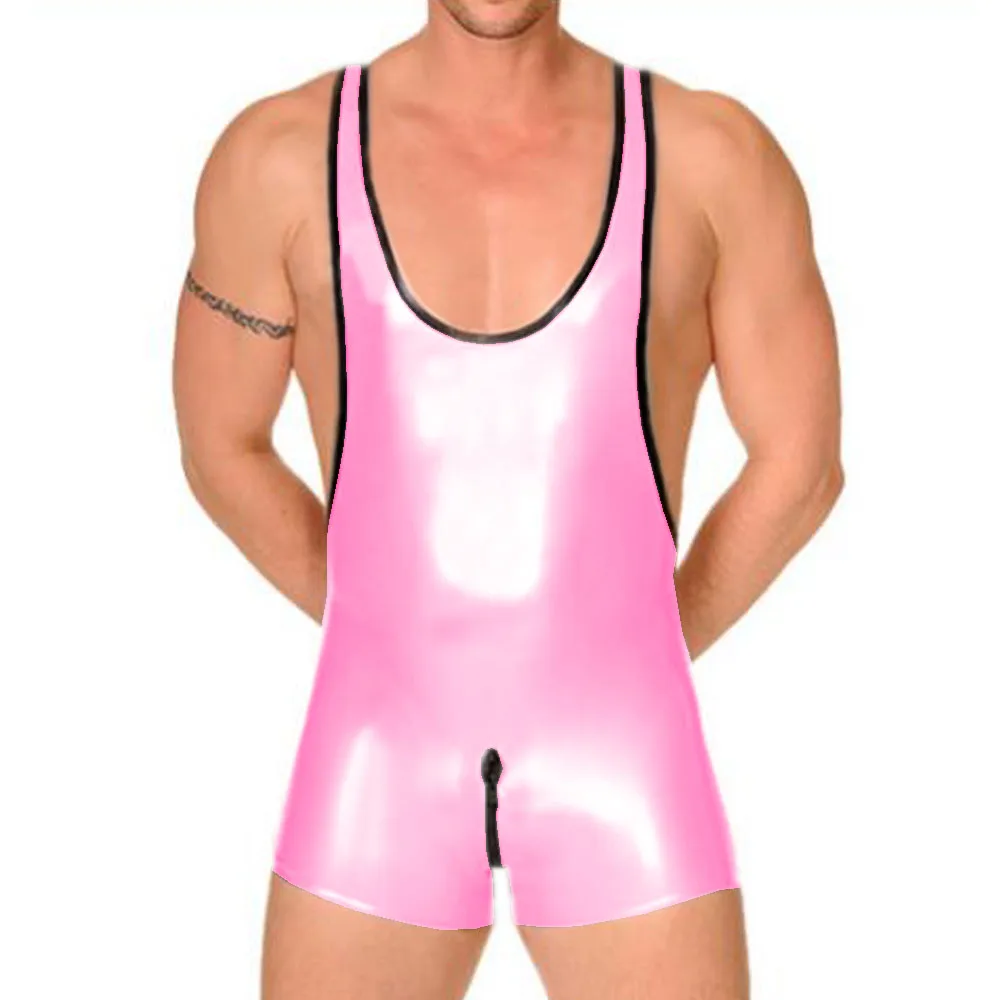 ANEROTIC Men’s Black PVC Deep U-Neck Sleeveless Bodysuit Jumpsuit