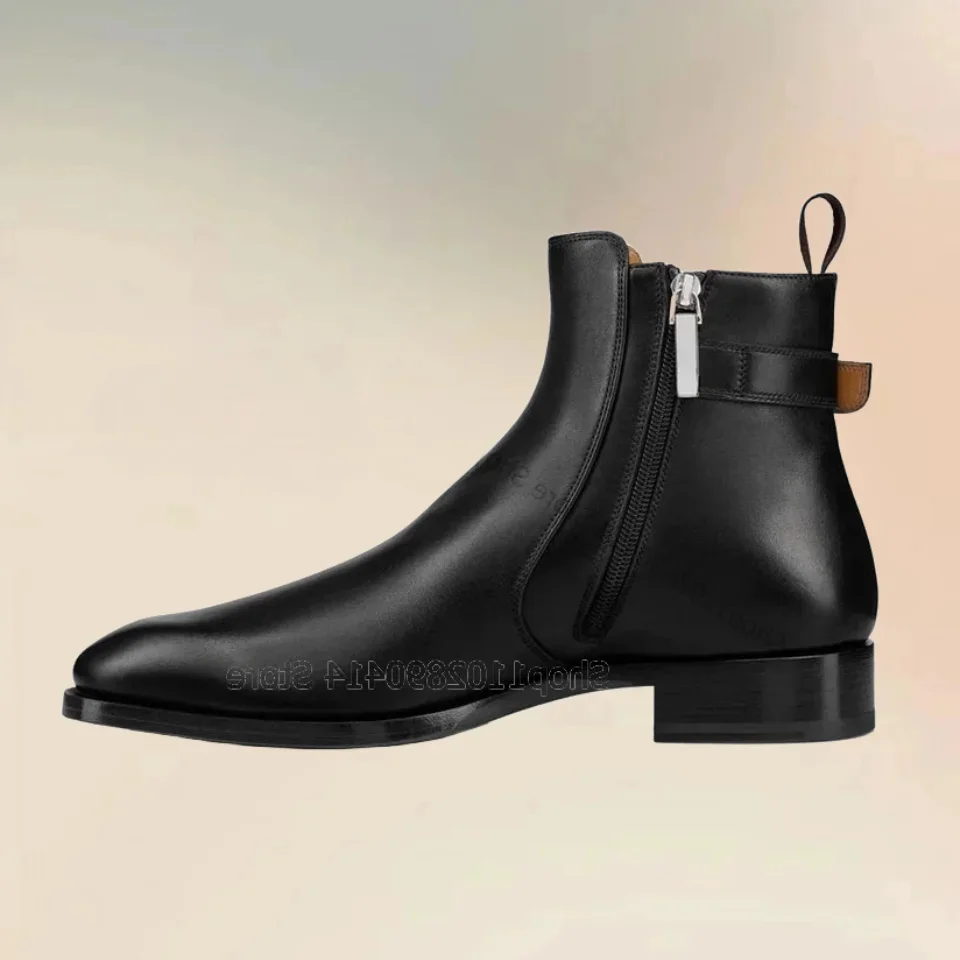 Black Buckle Decor Square Toe Ankle Boots Fashion Side Zipper Men Shoes Luxuriou