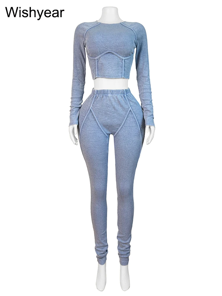 Fitness Blue Knitted Ribbed Street Jogging Tracksuits Women's Long Sleeve Crop T
