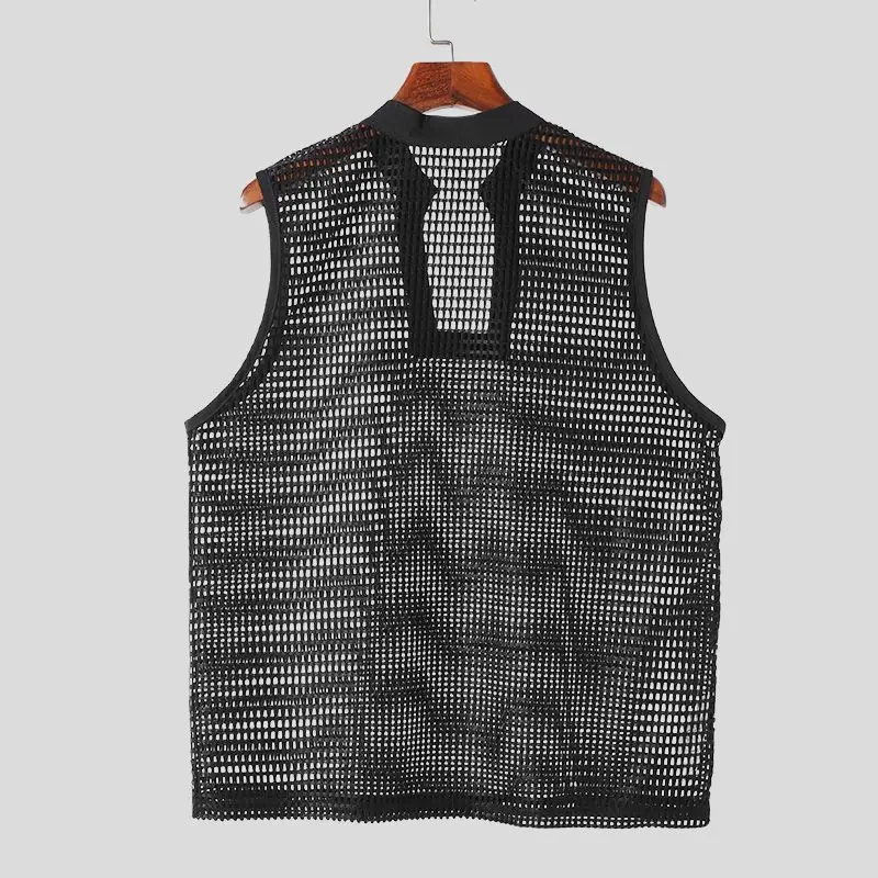 Men Tank Tops Solid Color Stand Collar Sleeveless Hollow Out Male Vests 2024 Tra