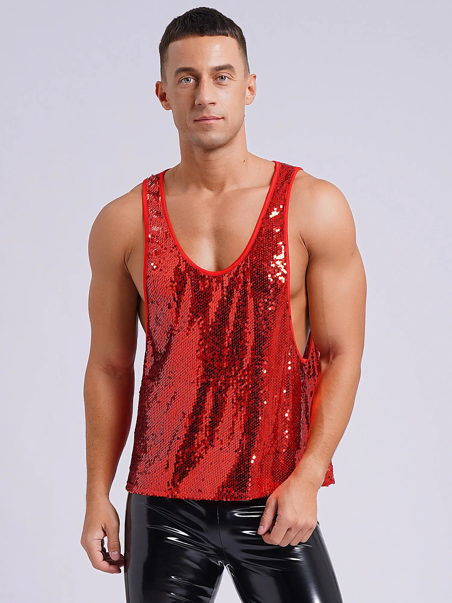 Mens Sequin Loose Vest Top Low Crew Neck Sleeveless Tee T-shirts Nightclub Stage