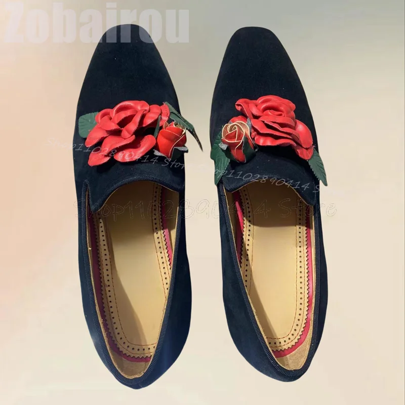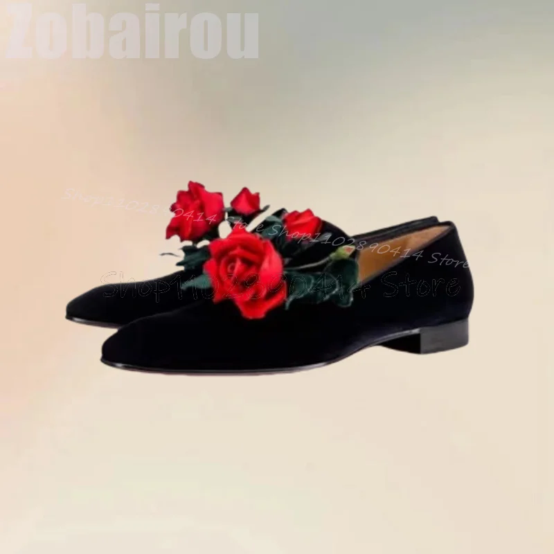 Red Appliques Decor Black Square Toe Flock Loafers Fashion Slip On Men Shoes Lux