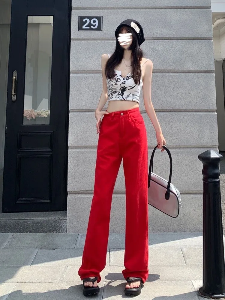 Red Christmas Wide Leg Jeans Women's New Year Red Loose High Waist Straight leg