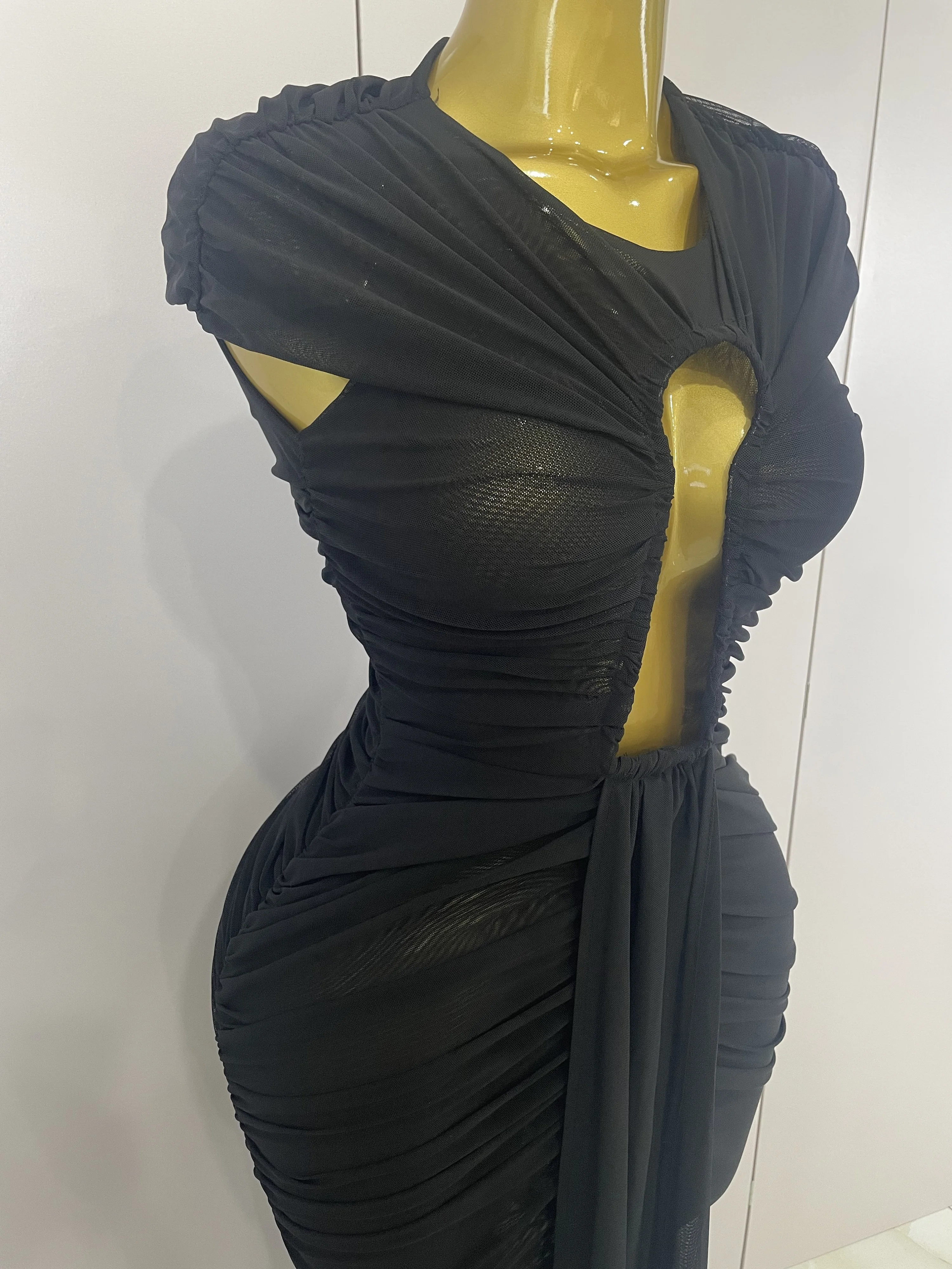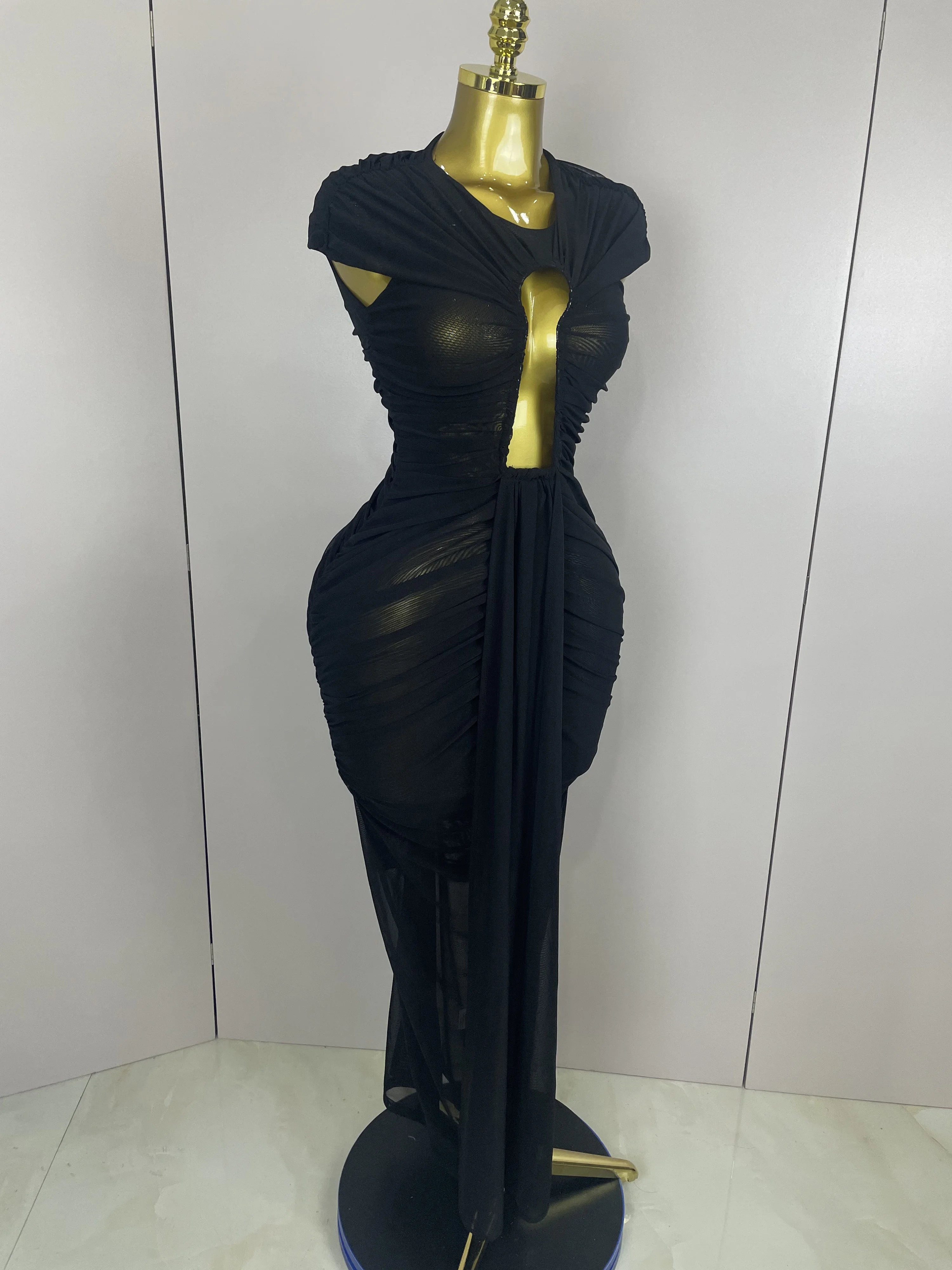 Sexy Sleeveless O-Neck Bodycon Mesh Long Dress 2025 Women Hollow Out Celebrate F
