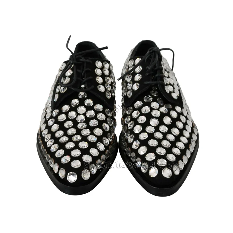 Silver Crystal Decor Black Pointed Toe Men Shoes Fashion Lace Up Male Shoes Luxu