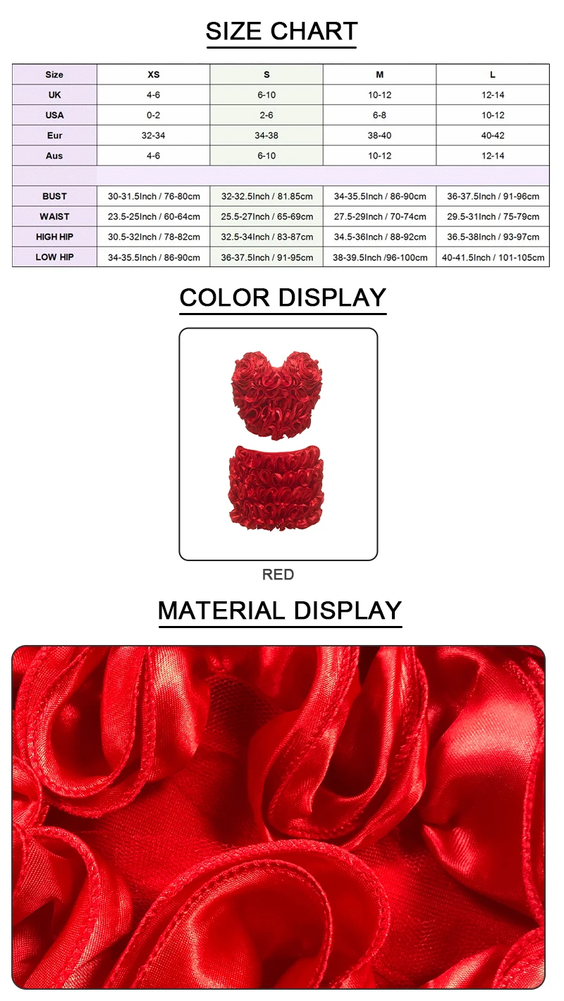 Make a fearless fashion statement with this red two - piece set. The strapless crop top and mini skirt are both adorned with lush rose - like ruffles, exuding passion and confidence. Ideal for parties, club nights or events where you want to stand out. Crafted with care for a flattering fit, available in multiple sizes.