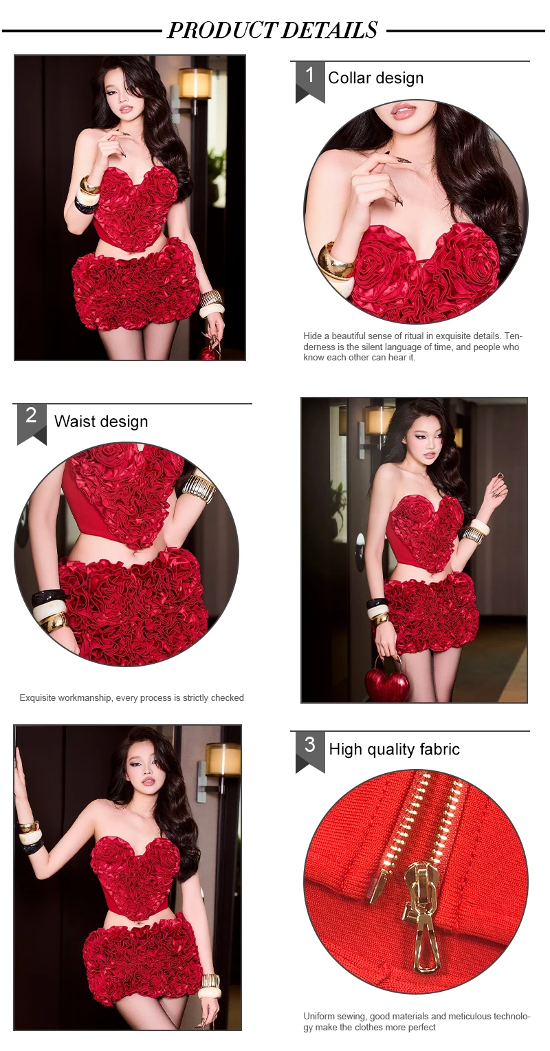VC | Women’s Red Strapless Rose Crop Top & Mini Skirt Set – Party Ready, Sla